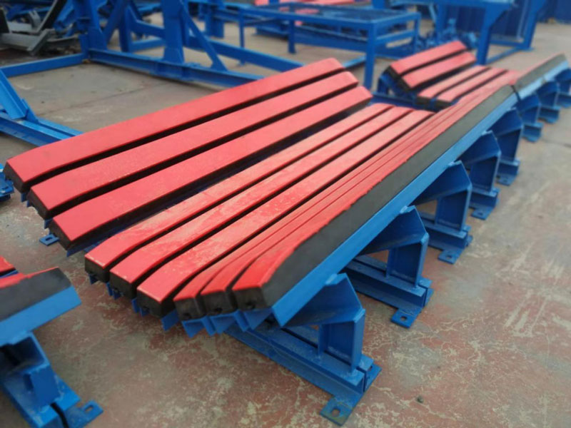 緩沖床主要用于替代緩沖托輥,緩沖床由緩沖條組成,而緩沖條主要應用優良的高彈性特種橡膠層充分有效吸收了物料下落時的沖擊力,大大降低了物料下落時對輸送帶的沖擊,真正的改善了落料點的受力狀況。并采用特殊的UHMW高分子聚乙烯表面,使輸送帶與緩沖條之間的摩擦系數降到最低,且耐磨性好。緩沖床的使用保證了輸送帶的面與面的接觸,受力均勻,有效防止了由于托輥斷裂、脫落造成的皮帶縱向撕裂,同時大大降低了皮帶被銳器或尖銳物料穿透后縱向撕裂的概率。